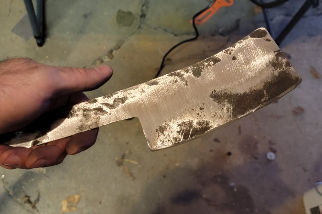 Started the lengthy process of sanding down the surface to a uniform quality. The recesses will hold oxidation until the entire face is ground down to that level. It’s not a difficult process, just time consuming and something to keep in mind while hammering in future.