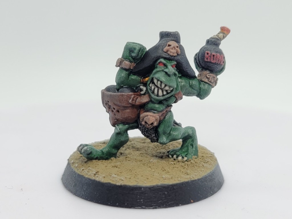 With the Lakeshore Clash Blood Bowl League kicking off this week I’m starting to look into star players that my Ogre team, the Manneslaughter Widekings can take on to help even things out. A bomb-throwing goblin with a pirate hat felt like an appropriate start.